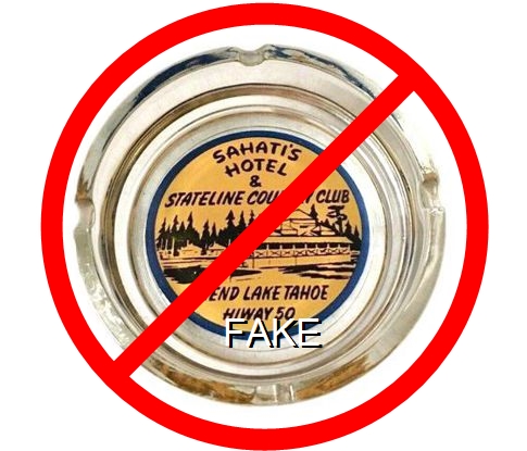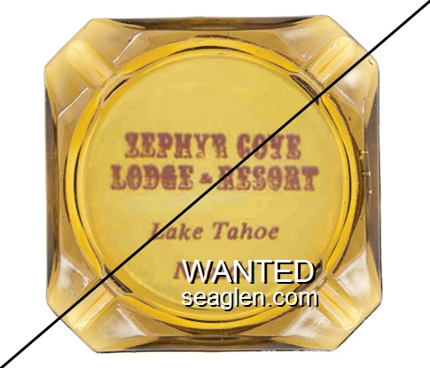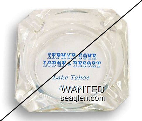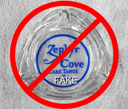 ZEP-91 Zephyr Cove Lodge 3 1/2" Clear Glass Ashtray "Zephyr Cove, Lake Tahoe in Nevada" - Blue on white (A silk screened fake, sold on eBay by seller greencOkecollector) |