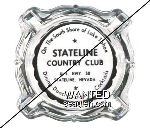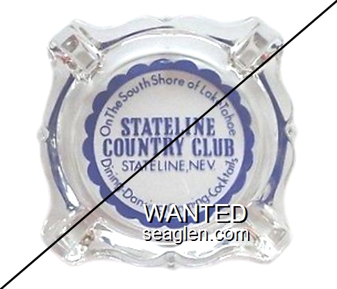 SCC-S1 Stateline Country Club 3 11/16" Clear Glass Ashtray "On the South Shore of Lake Tahoe, Stateline Country Club, U.S. Hwy. 50, Stateline, Nevada, Dining - Dancing - Gaming - Cocktails" - Black on white (Like SCC-02, except black on white imprint) |