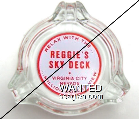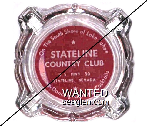 SCC-Q2 Stateline Country Club 3 11/16" Clear Glass Ashtray "On the South Shore of Lake Tahoe, Stateline Country Club, U.S. Hwy. 50, Stateline, Nevada, Dining - Dancing - Gaming - Cocktails" - White on red (Imprint has no scalloped outline) |
