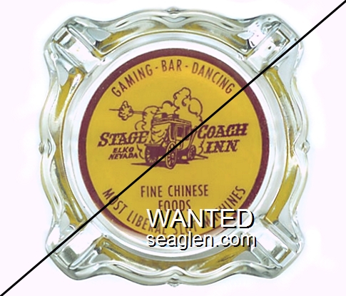 SCI-A2 Stagecoach Inn (Elko) 3 11/16" Clear Glass Ashtray "Gaming - Bar - Dancing, Stage Coach Inn, Elko Nevada, Fine Chinese Foods, Most Liberal Slot Machines" - Red on yellow |