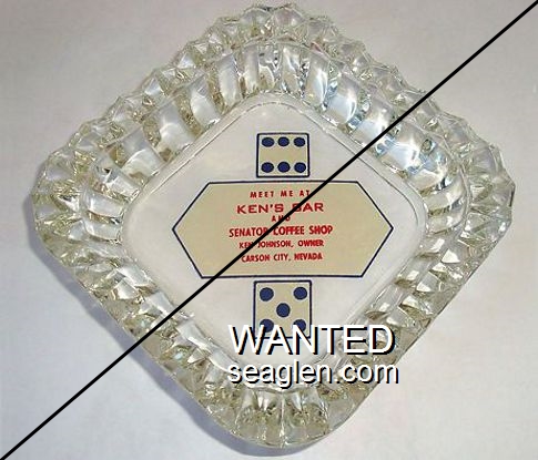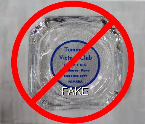 VIC-91 Victory Club 4" Clear Glass Ashtray "Tommy's Victory Club, Gaming, Racehorse Keno, Carson City Nevada" - Blue silkscreen (A silk screened fake, sold on eBay by seller greencOkecollector) |