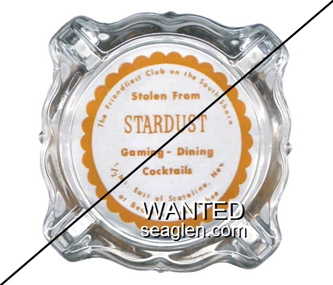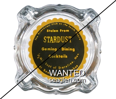 SLT-A2 Stardust (Lake Tahoe) 3 11/16" Clear Glass Ashtray "The Friendliest Club on the South Shore, Stolen From Stardust, Gaming - Dining Cocktails, 1/2 Mi. East of Stateline, Nev., at Beautiful Lake Tahoe" - Orange on black |