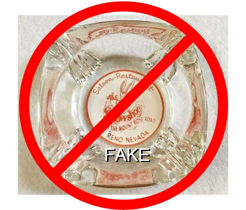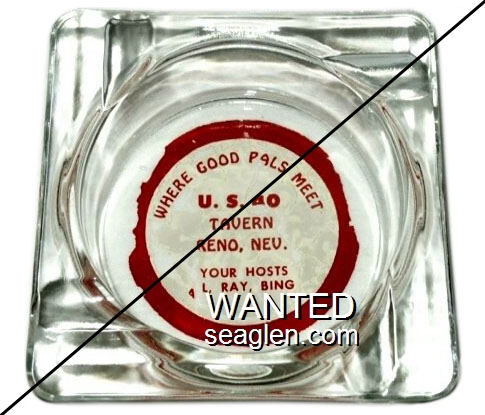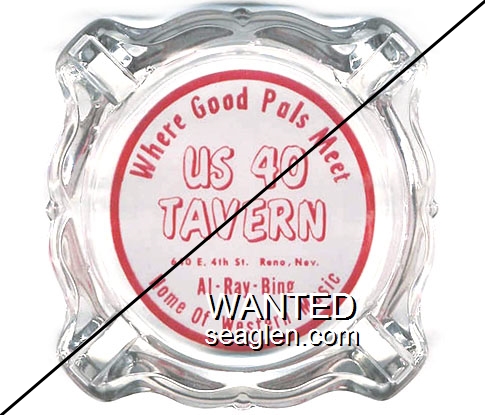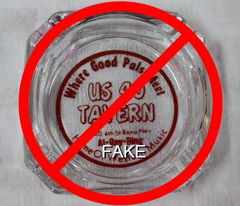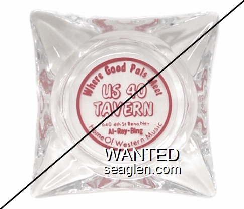 UST-91 US 40 Tavern 4" Clear Glass Ashtray "Where Good Pals Meet, US 40 Tavern, 640 E. 4th St. Reno, Nev., Al - Ray - Bing, Home of Western Music" - Red silkscreen (A silk screened fake, sold on eBay by seller greencOkecollector) |