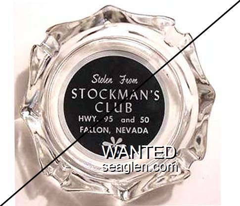 STO-N1 Stockman's Bar & Restaurant 3 3/4" Clear Glass Ashtray "Stolen From Stockman's Club, Hwy. 95 and 50, Fallon, Nevada" - White on black |