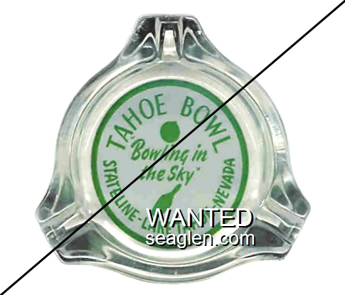 TBL-A1 Tahoe Bowl 3 1/2" Clear Glass Ashtray "Tahoe Bowl, ''Bowling in the Sky'', Stateline - Lake Tahoe - Nevada" - Green on white |