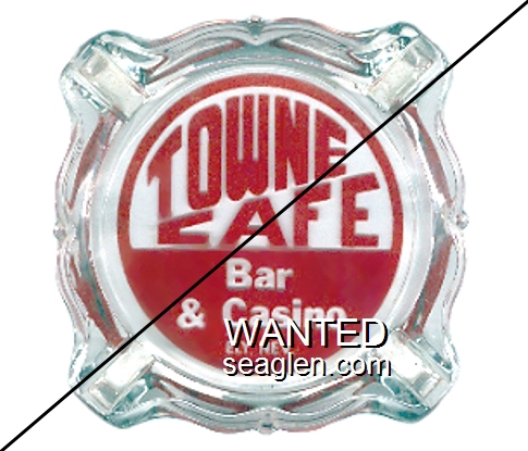 TCB-A1 Towne Cafe & Bar 3 11/16" Clear Glass Ashtray "Towne Cafe Bar & Casino, Ely, Nev." - Red on white |