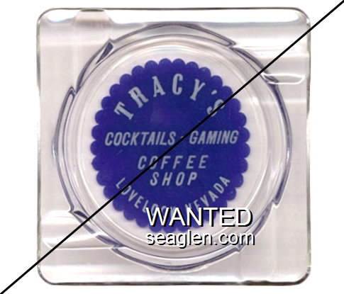 TCY-A1 Tracy's 4 1/4" Clear Glass Ashtray "Tracy's Cocktails - Gaming, Coffee Shop, Lovelock, Nevada" - White on blue |