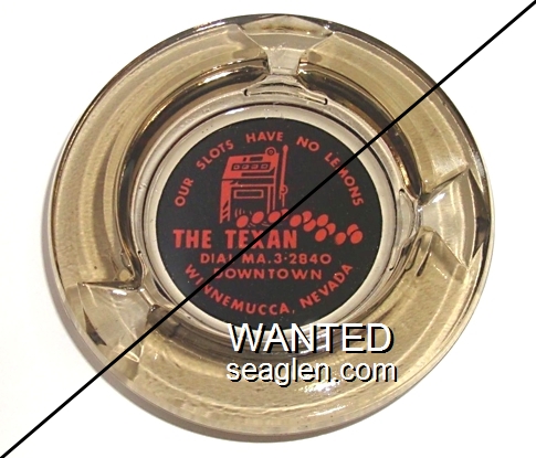 TEX-B1 Texan, The (Winnemucca) 4" Smoke Glass Ashtray "Our Slots Have No Lemons. The Texan, Dial MA. 3-2840, Downtown, Winnemucca, Nevada" - Red on black |
