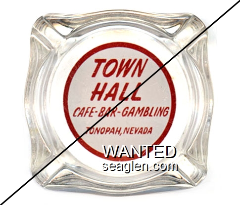 THC-A1 Town Hall Club 3 7/16" Clear Glass Ashtray "Town Hall, Cafe - Bar - Gambling, Tonopah, Nevada" - Red on white |