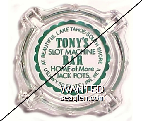TNY-A1 Tony's Bar 3 11/16" Clear Glass Ashtray "At Beautiful Lake Tahoe - South Shore, Tony's Slot Machine Bar, Home of More Jack Pots, U.S. Hwy. 50 State Line, Nev." - Green |