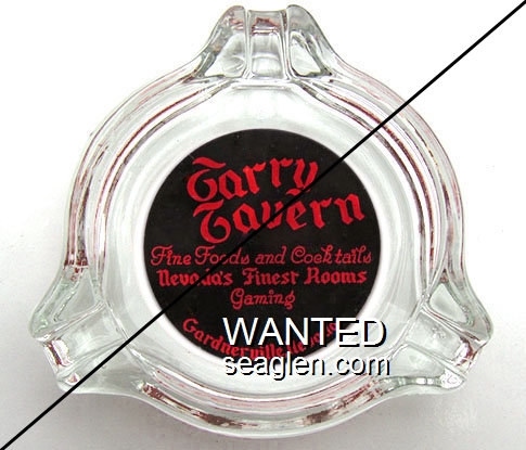 TTV-A1 Tarry Tavern 3 1/2" Clear Glass Ashtray "Tarry Tavern, Fine Foods and Cocktails, Nevada's Finest Rooms, Gaming, Gardnerville, Nevada" - Red on black |