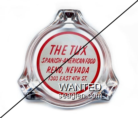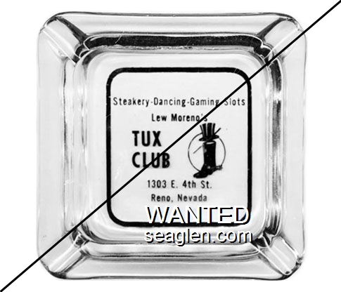 TUX-C1 Tux, The, Reno 4 1/4" Clear Glass Ashtray "Steakery - Dancing - Gaming - Slots, Lew Moreno's Tux Club, 1303 E. 4th St., Reno, Nevada" - Black |
