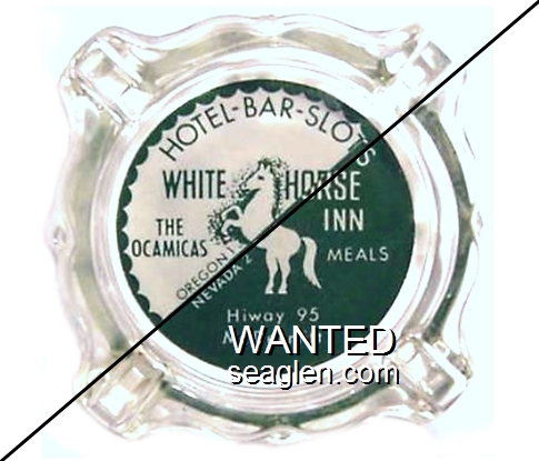 WHI-A1 White Horse Inn 3 11/16" Clear Glass Ashtray "Hotel - Bar - Slots, White Horse Inn, The Ocamicas, Meals, Oregon 1, Nevada 2, Hiway 95, McDermitt" - White and green |