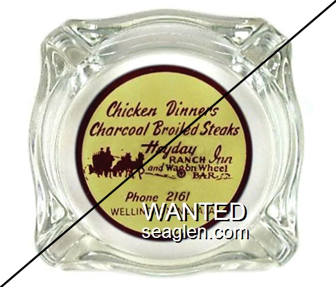 WWB-A1 Wagon Wheel Bar - Heyday Inn 3 7/16" Clear Glass Ashtray "Chicken Dinners, Charcoal Broiled Steaks, Heyday Ranch Inn and Wagon Wheel Bar, Phone 2161, Wellington, Nevada" - Brown on yellow |