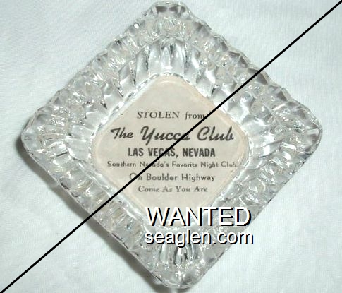 YUC-A1 Yucca Club 4 1/2" Clear Glass Ashtray "Stolen From The Yucca Club, Las Vegas, Nevada, Southern Nevada's Favorite Night Club, On Boulder Highway, Come As You Are" - Black on white |