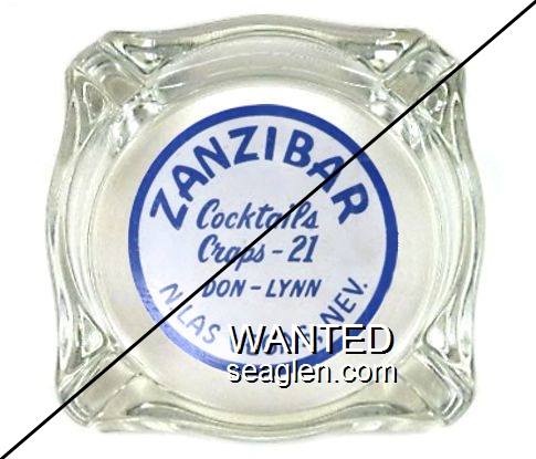 ZAN-02 Zanzibar 3 7/16" Clear Glass Ashtray "Zanzibar, Cocktails, Craps - 21, Don - Lynn, N. Las Vegas, Nev" - Blue on white |