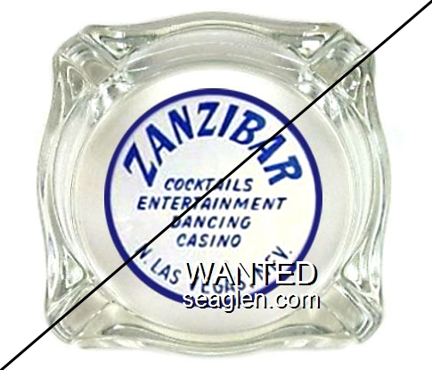 ZAN-A2 Zanzibar 3 7/16" Clear Glass Ashtray "Zanzibar, Cocktails, Entertainment, Dancing, Casino, N. Las Vegas, Nev." - Blue on white |